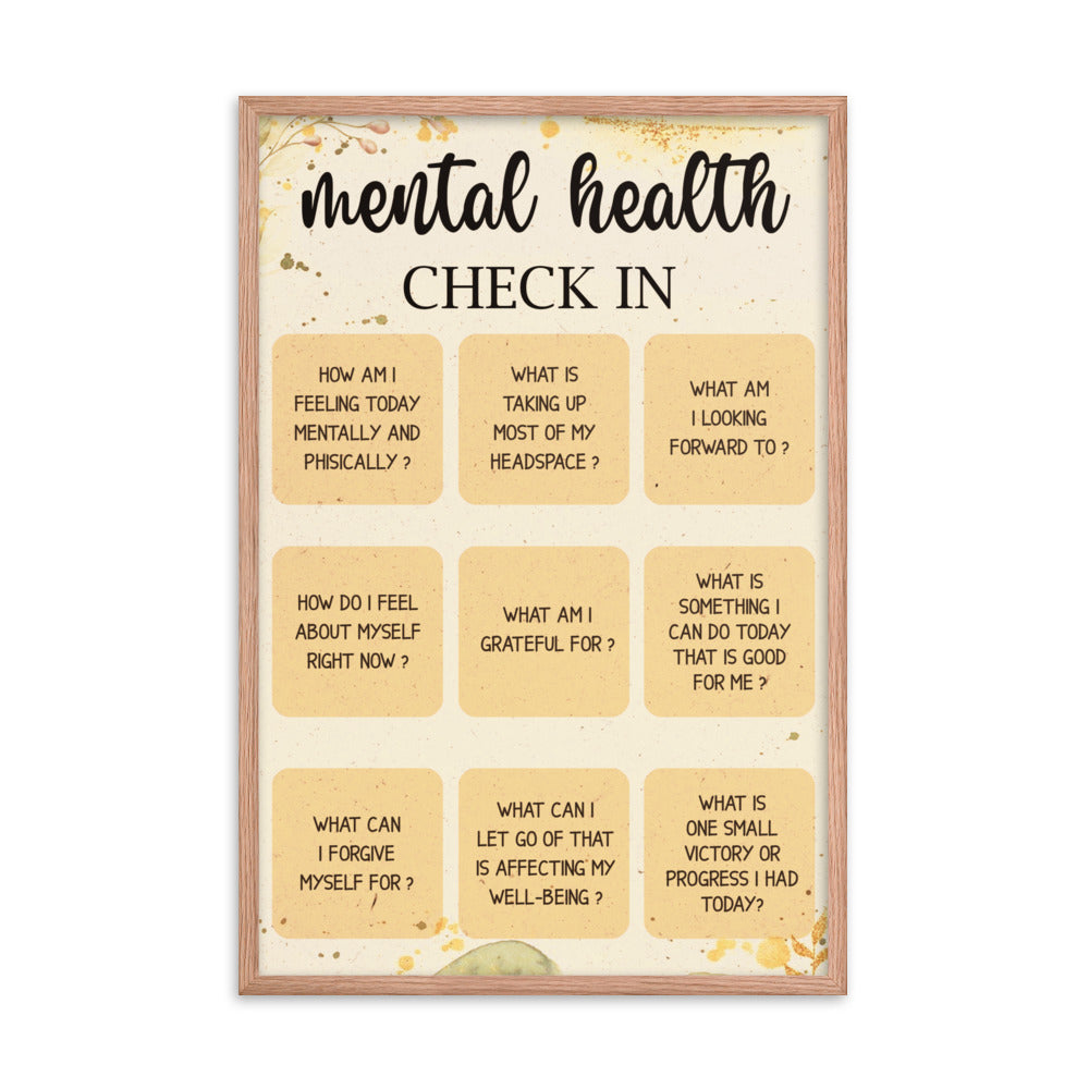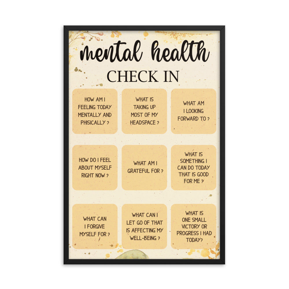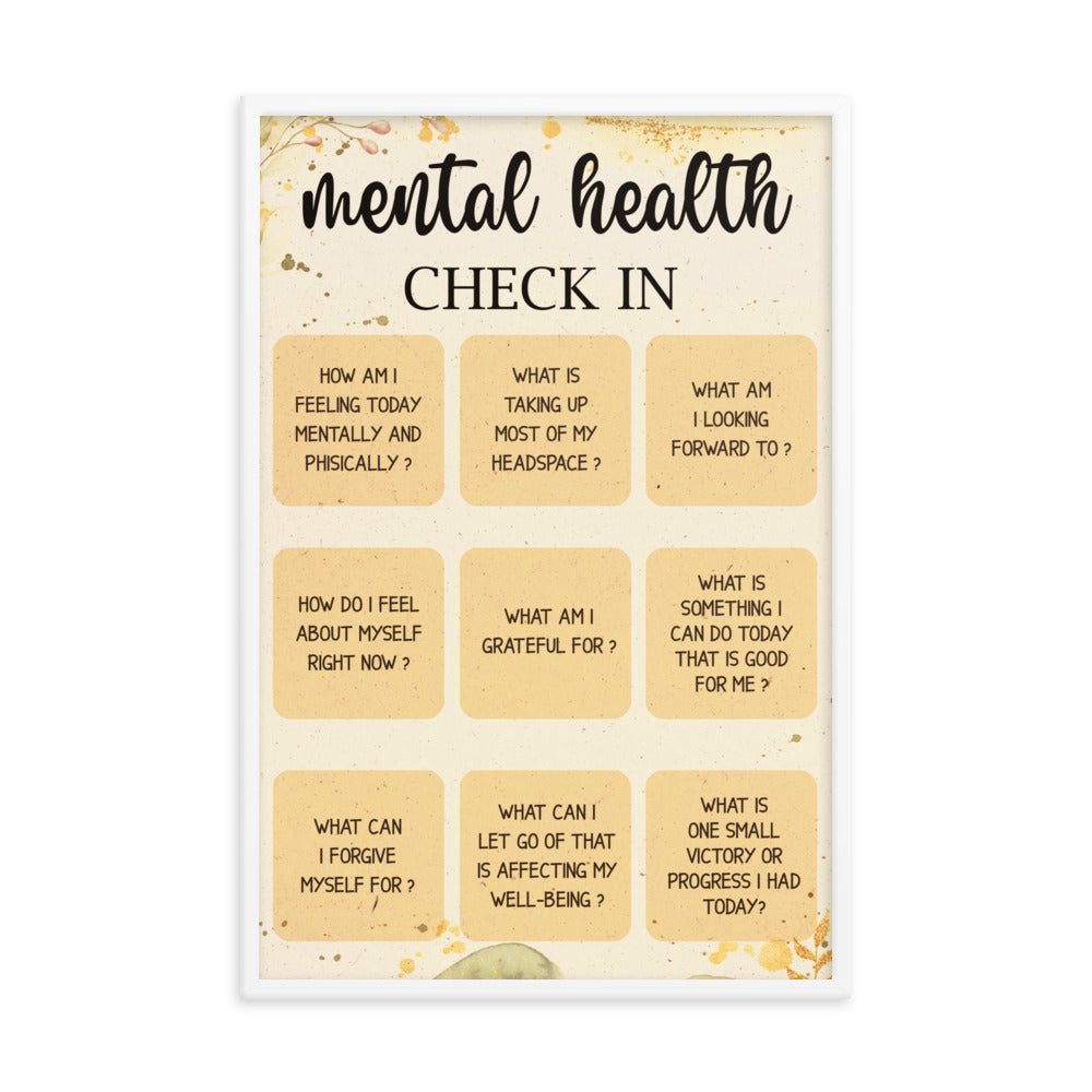Mental Health Awareness Check-In poster. Measuring 24"x36", this poster serves as a gentle reminder to prioritize your mental well-being. Featuring a series of thoughtful questions such as "What am I grateful for?", "What can I forgive myself for?", and "What am I looking forward to?", this poster encourages self-reflection and self-care.
