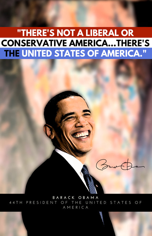 A colorful and patriotic poster of the 44th President of the United States Barack Obama and his quote from his keynote speech at the 2004 Democratic National Convention: "There's not a liberal or conservative America...there's the United States of America." Available in two sizes: 11"x17" and 18"x24". Great for inspiration, gift, framing, home, office, educational institutions, etc. Delivery: Unframed. Comes in a mailing tube.