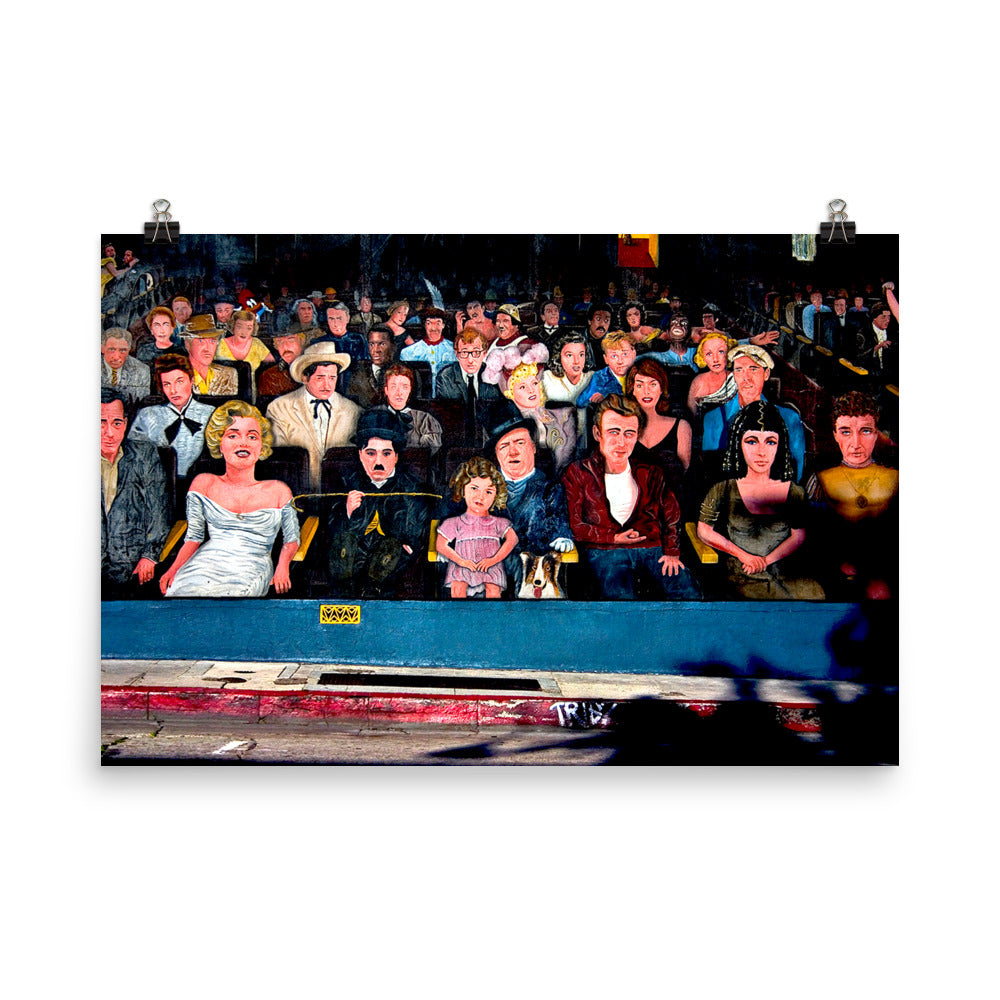 Tri-Seven Entertainment's original photographical work of the mural at Hollywood Blvd. and Wilcox Ave. in Hollywood, California. Famous movies stars such as Marilyn Monroe, Charlie Chaplin, Clark Gable, Sidney Poitier, Robert Redford and others can be seen in this historical mural. Unframed. Various sizes. Perfect for gift, room, office, etc. Museum-quality posters made on thick and durable matte paper. Add a wonderful accent to your room and office with these posters that are sure to brighten any environment. • Paper thickness: 10.3 mil • Paper weight: 5.6 oz/y² (192 g/m²) • Giclée printing quality • Opacity: 94% Ships in 2-5 business days.